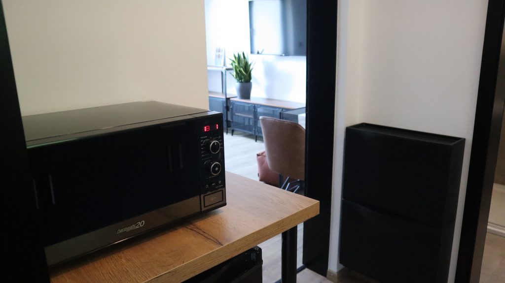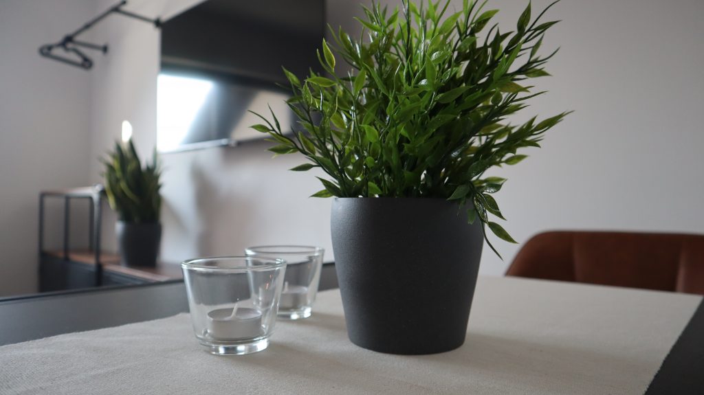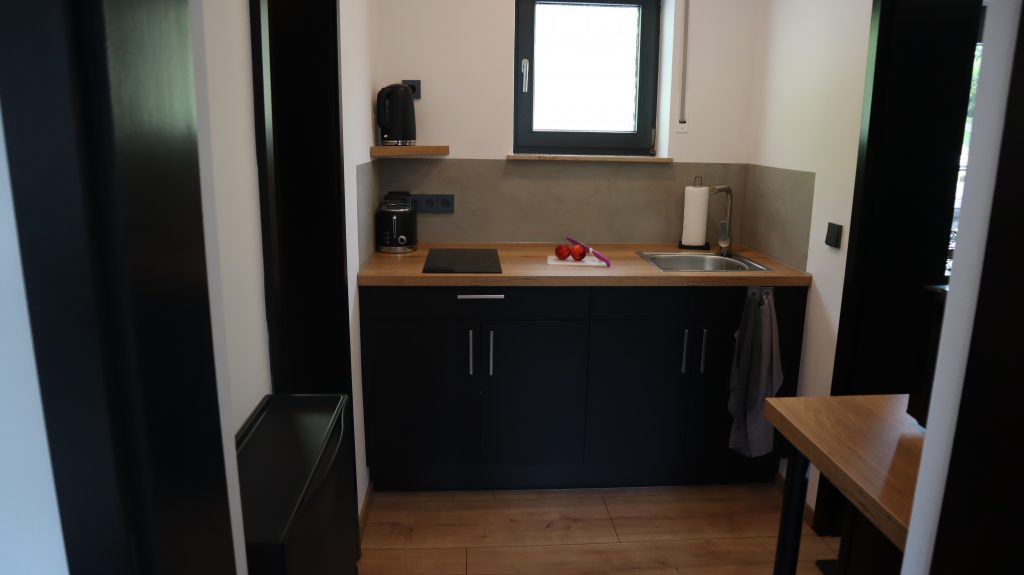 Das Schlafzimmer ist mit einem komfortablen Boxspringbett ausgestattet – perfekt für erholsamen Schlaf. Genießen Sie gemeinsame Mahlzeiten in der stilvollen Essecke. Die kleine, moderne Kochnische bietet alles, was Sie für die Zubereitung leckerer Speisen brauchen. Das elegante Badezimmer ist mit einer Regendusche ausgestattet und sorgt für einen frischen Start in den Tag.